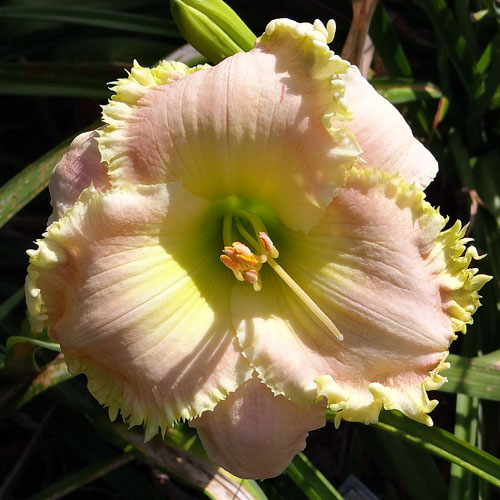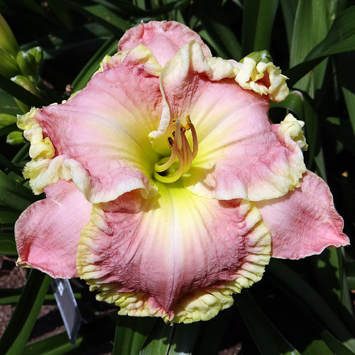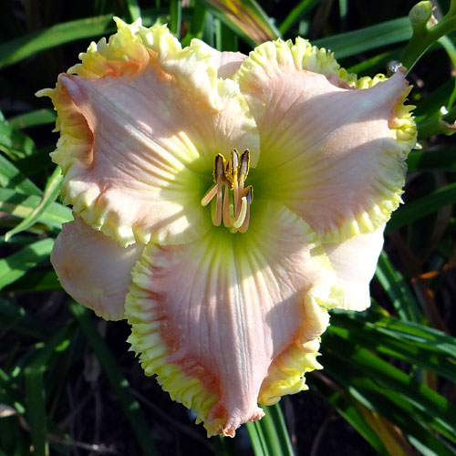 Seedling 13-056 has 6" blooms on 24" scapes and comes from the cross (Carefree Sunset X Steve Martin). A wide yellow-green throat and heavily ruffled yellow-green edge on clear light pink petals earns it a spot in my garden. Unfortunately, all blooms don't open as well as the picture but that can be said for most daylilies.