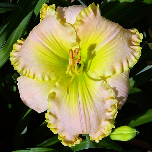 Seedling 14-058 has 5.5" blooms on 24" scapes and comes from the cross (What Love Can Do X Priscilla's Smile).